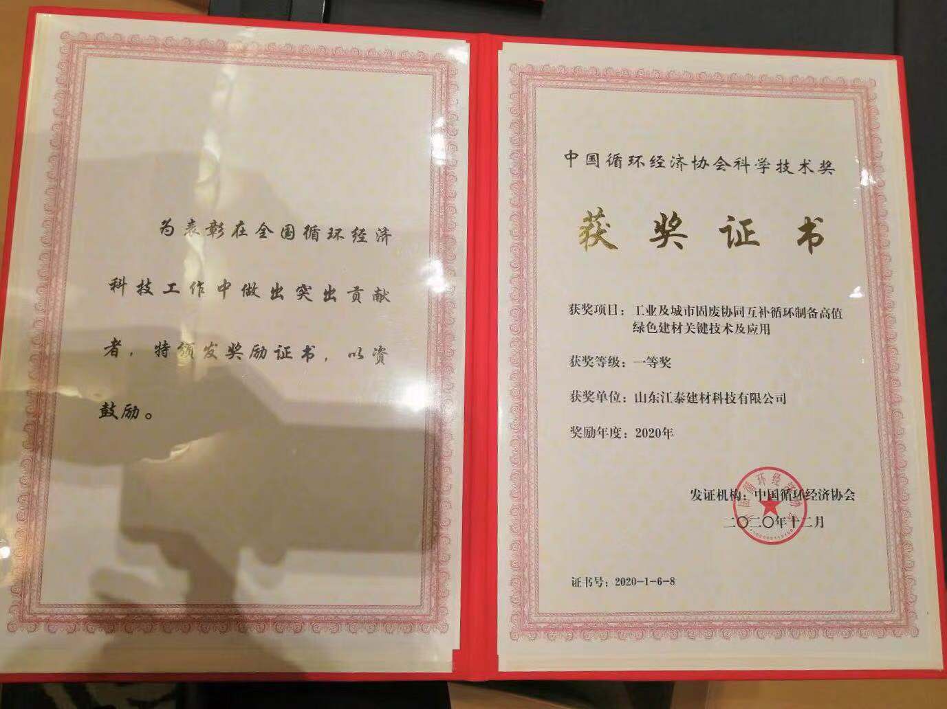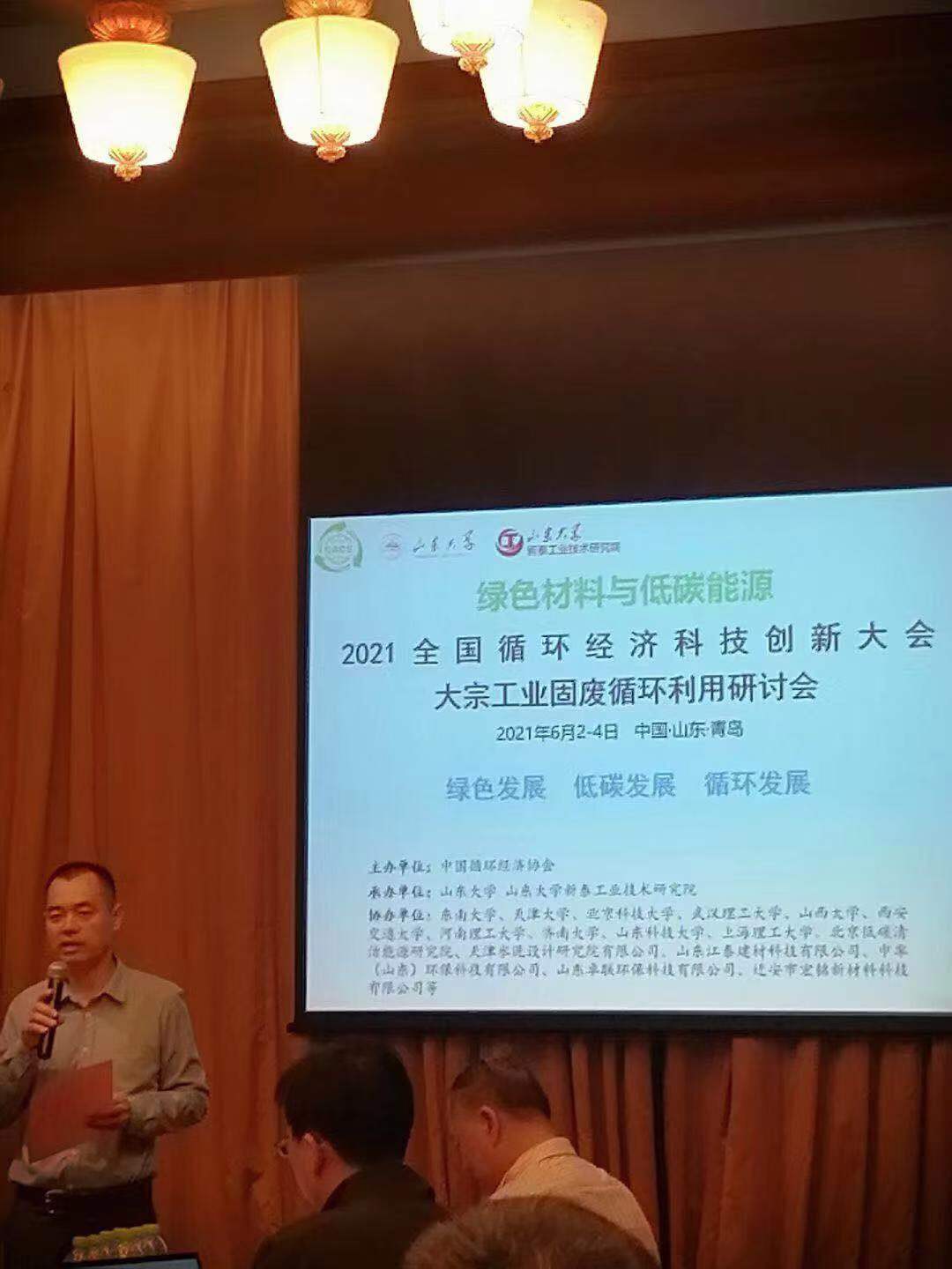 2021年6月2日中國循環(huán)經(jīng)濟(jì)協(xié)會主辦“2021全國循環(huán)經(jīng)濟(jì)科技創(chuàng)新大會——大宗工業(yè)固廢循環(huán)利用研討會”在山東青島正式召開!對2020年在循環(huán)經(jīng)濟(jì)科技創(chuàng)新中做出貢獻(xiàn)的單位和個(gè)人進(jìn)行表彰。山東江泰建材科技有限公司及公司董事長馮正義分別獲得“工業(yè)及城市固廢協(xié)同互補(bǔ)循環(huán)制備綠色建材關(guān)鍵技術(shù)及應(yīng)用”項(xiàng)目的單位及個(gè)人一等獎(jiǎng)!