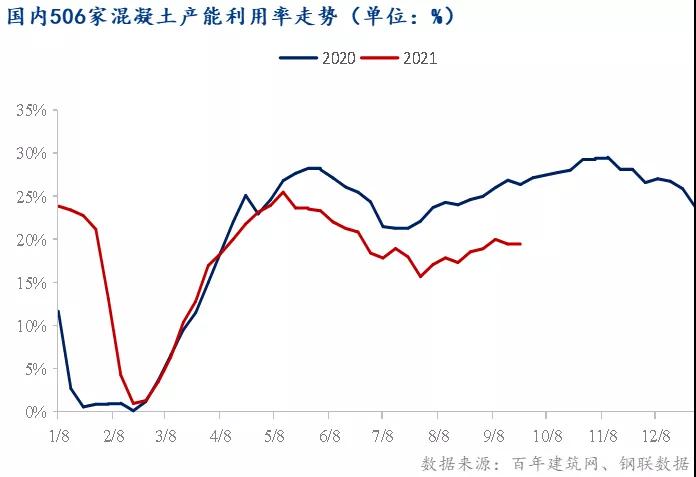 截至9月22日,百年建筑網(wǎng)跟蹤國內(nèi)混凝土企業(yè)出貨情況,本周國內(nèi)500余家混凝土出貨量略有下降,9月15日-9月22日期間,混凝土平均產(chǎn)能利用率為19.39%,較上周小幅下降0.07%,符合上周預(yù)期,較去年同期低6.89個百分點。2021年多家房地產(chǎn)“暴雷”,華夏、泰禾、恒大、三盛、寶能、實地等企業(yè)面臨債務(wù)危機(jī),背后引發(fā)多項連鎖反應(yīng),而混凝土在房建項目上使用的比例較大,因此相比于2020年混凝土產(chǎn)能利用率大幅降低。本期混凝土反饋原料供應(yīng)不足是影響混凝土出貨量的直接原因。國內(nèi)大面積限電,以及部分地區(qū)“雙控”導(dǎo)致水泥原料價格繼續(xù)爬升,且供應(yīng)量減少,混凝土企業(yè)原料庫存偏低,因此本期混凝土產(chǎn)能利用率小幅走低。