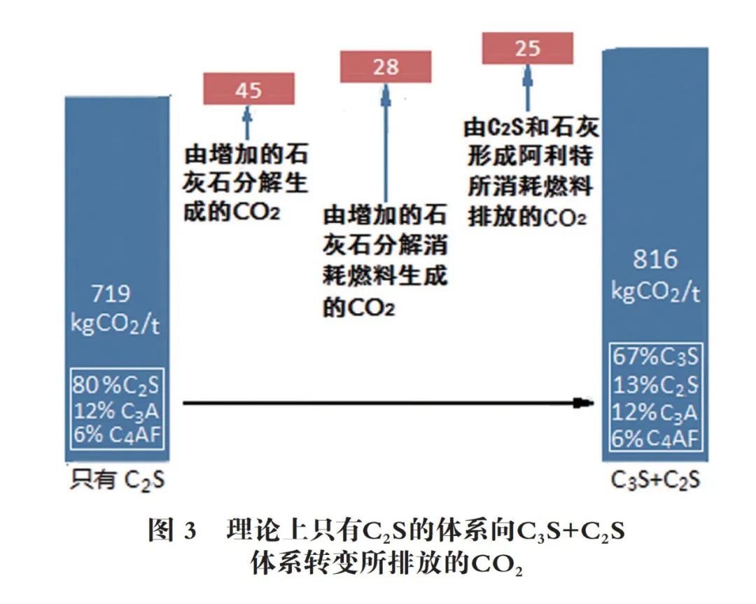 在傳統(tǒng)硅酸鹽水泥熟料主要4種礦物中,其碳足跡的順序是:C4AF<C2S<C3A<C3S。由圖3可見,在較低溫度下燒成的硅酸鹽熟料中只有C2S,溫度升高至出現(xiàn)熔融液,把一部分C2S轉(zhuǎn)變成C3S,則需要補(bǔ)充石灰石,石灰石分解會(huì)生成44kg/t的CO2;所消耗燃料會(huì)排出28kg/t的CO2;C2S與CaO生成阿利特所消耗的燃料排放25kg/t的CO2。最后生成C3S+C2S的硅酸鹽熟料,其排放的CO2總量增加13.6%;反過來,如果留下C2S,放棄C3S,則可以減少12% CO2的排放。但是代價(jià)是降低早期強(qiáng)度,使混合材的摻用受到限制。為了克服這個(gè)問題,文獻(xiàn)[1]報(bào)道了一個(gè)熟料的新品種─貝利特-硫鋁酸鈣-鐵相(Belite-Calcium Sulfoaluminate-Ferrite,縮寫為BC AF)熟料。該熟料中以活性C2S取代C3S和C3A。以無水硫鋁酸鈣C4A3 提高早期強(qiáng)度是通過加入硫酸鈣在和熟料共同粉磨成水泥水化后實(shí)現(xiàn)的,可以達(dá)到與硅酸鹽水泥熟料相同的早期強(qiáng)度, 而CO2排放量卻可顯著地減少31%。