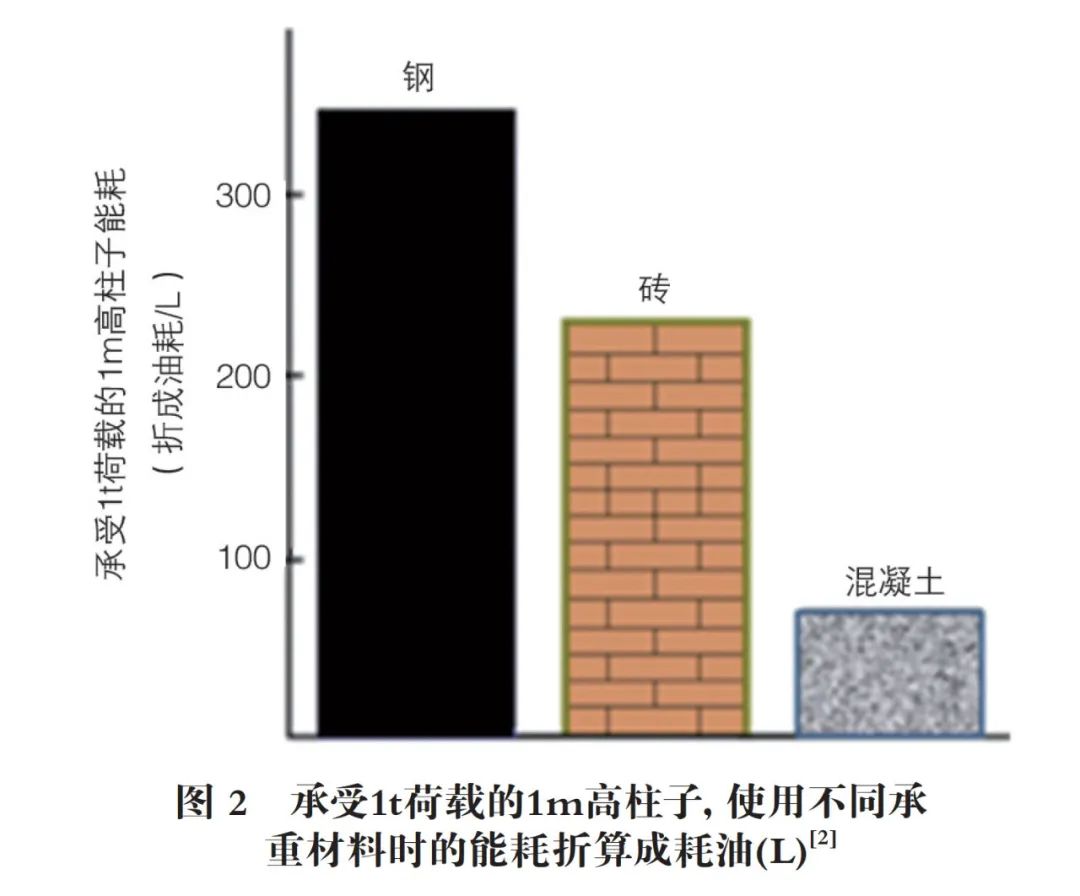 按制成相同承載力、相同高度的柱子,混凝土和傳統(tǒng)結(jié)構(gòu)用材料─磚石、鋼材相比,如圖2所示,折算成油耗,承受1t荷載的1m高柱子,混凝土能耗不到100L,磚的超過200L;鋼的則約達(dá)到350L。