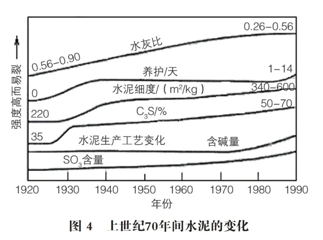 用石灰石和黏土為原料制作水硬性膠凝材料的歷史,在1824年英國J.Aspdin申請硅酸鹽水泥專利至少28年之前就已經(jīng)開始。經(jīng)歷了200多年的應(yīng)用和發(fā)展,歷來被追求的就是高CS、高強(qiáng)、低能耗。由于工藝的不斷進(jìn)步,近100年來,硅酸鹽水泥得到了很大的發(fā)展。圖4為上世紀(jì)西方水泥的變化。近年來,我國水泥的相應(yīng)變化與此大體一致,如下:常用水灰比(應(yīng)為混凝土的)0.30~0.5;養(yǎng)護(hù)(大多數(shù)工民建)0~3天,重要工程3~7天;水泥細(xì)度(比表面積m2/kg)350~400;C3S(%) 57~60%;SO3含量(%)0~2.5。這樣的演變,卻使硅酸鹽水泥越來越不好用,混凝土因而耐久性不可靠。更與節(jié)能、降耗相悖。