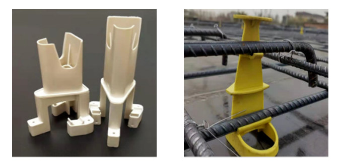 在混凝土澆筑前,通過(guò)成品板厚控制器翼緣上的小孔固定在模板上,混凝土澆筑施工收面磨光至控制器上翼緣時(shí),板厚即達(dá)到設(shè)計(jì)標(biāo)準(zhǔn)。同時(shí),中空的造型也確?;炷聊軌驖仓軐?shí),有效地與周邊混凝土粘結(jié)牢固。