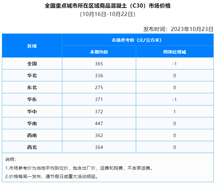 10月第3周,全國商品混凝土均價365元/立方米,較前一周下跌1元/立方米。整體來看,本周協(xié)會重點關(guān)注的36個城市中,2個城市商品混凝土均價下跌,其中青島跌幅較大;4個城市商品混凝土均價上漲,其中濟南漲幅較大;30個城市商品混凝土均價與上周一致。