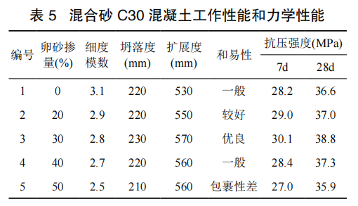 以 C30 混凝土為例,測試了卵機砂摻量對混合砂混凝土工作性能和強度的影響,見表 5。