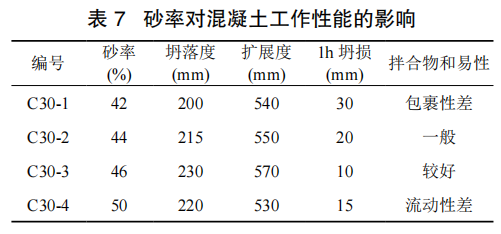 采用表 6 所示混凝土配合比,研究砂率調(diào)整對混凝土的工作性能的影響,結(jié)果見表 7。