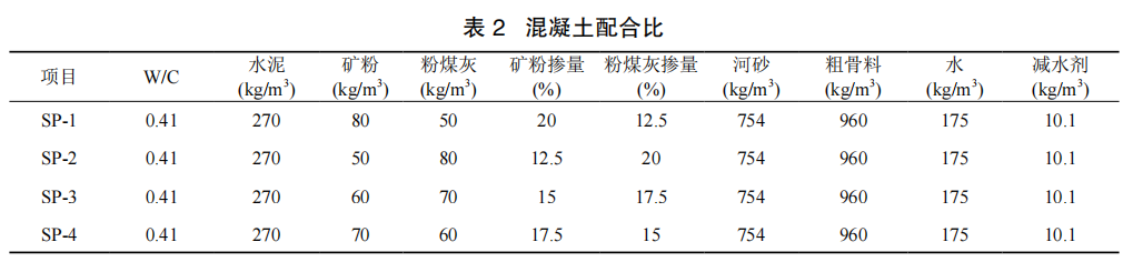 為了確定礦物摻合料的最優(yōu)摻量,以及減少砂率、水膠比、漿骨比等因素的影響,制定大量的膠砂配合比并按照配比制備 40mm×40mm×160mm 的膠砂試塊,然后進(jìn)行 3d、7d、28d 抗壓強(qiáng)度測(cè)試,最后得出:當(dāng)?shù)V物摻合料的取代率為 37% 時(shí),膠砂試塊的抗壓強(qiáng)度最大。試驗(yàn)以膠砂配合比為參考,以相同取代率(37%)為條件,對(duì)混凝土配合比進(jìn)行設(shè)計(jì)優(yōu)化,得到以下幾組混凝土配合比,如表 2 所示。