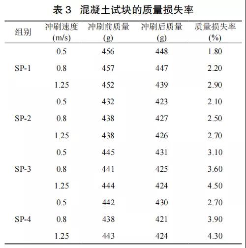 由圖 3 中可知,當(dāng)模擬海水沖刷速度為 0.5m/s、0.8m/s 時(shí),SP-1 所對(duì)應(yīng)的配合比制備的混凝土試塊的耐沖刷性能最好;當(dāng)沖刷速度達(dá)到 1.25m/s 時(shí),SP-2 所對(duì)應(yīng)的配合比混凝土試塊的耐沖刷性能最好。從圖中還可以看出,隨著沖刷速度的增大,SP-1 對(duì)應(yīng)的折線的斜率幾乎不變,但 SP-2 對(duì)應(yīng)的折線的斜率在減小,說明當(dāng)沖刷速度繼續(xù)增大,SP-2 對(duì)應(yīng)的配合比混凝土試塊的質(zhì)量損失率的增加速度與 SP-1 相比逐漸減小,兩者的質(zhì)量損失率的差距逐漸增大。從表 3 中可以看出,當(dāng)沖刷速度為 0.5m/s 時(shí),SP-1 對(duì)應(yīng)配合比混凝土試塊的質(zhì)量損失率比 SP-2、SP-3、SP-4 分別降低 14%、42% 和 52%;當(dāng)沖刷速度為 0.8m/s 時(shí),SP-1 對(duì)應(yīng)的配合比混凝土試塊的質(zhì)量損失率比 SP-2、SP-3、SP-4 分別降低 12%、39% 和 44%;當(dāng)沖刷速度為 1.25m/s 時(shí),SP-2 對(duì)應(yīng)的配合比混凝土試塊的質(zhì)量損失率比 SP-1、SP-3、SP-4 分別降低 7%、40% 和 37%。根據(jù)數(shù)據(jù)對(duì)比以及折線圖比較,當(dāng)沖刷速度<1m/s 時(shí),SP-1 對(duì)應(yīng)的配合比混凝土試塊的耐沖刷性能最好;當(dāng)沖刷速度>1m/s 時(shí),SP-2 對(duì)應(yīng)的配合比混凝土試塊的耐沖刷性能最好,所以試驗(yàn)人員可以根據(jù)混凝土所處的實(shí)際環(huán)境來選擇合適的配合比。